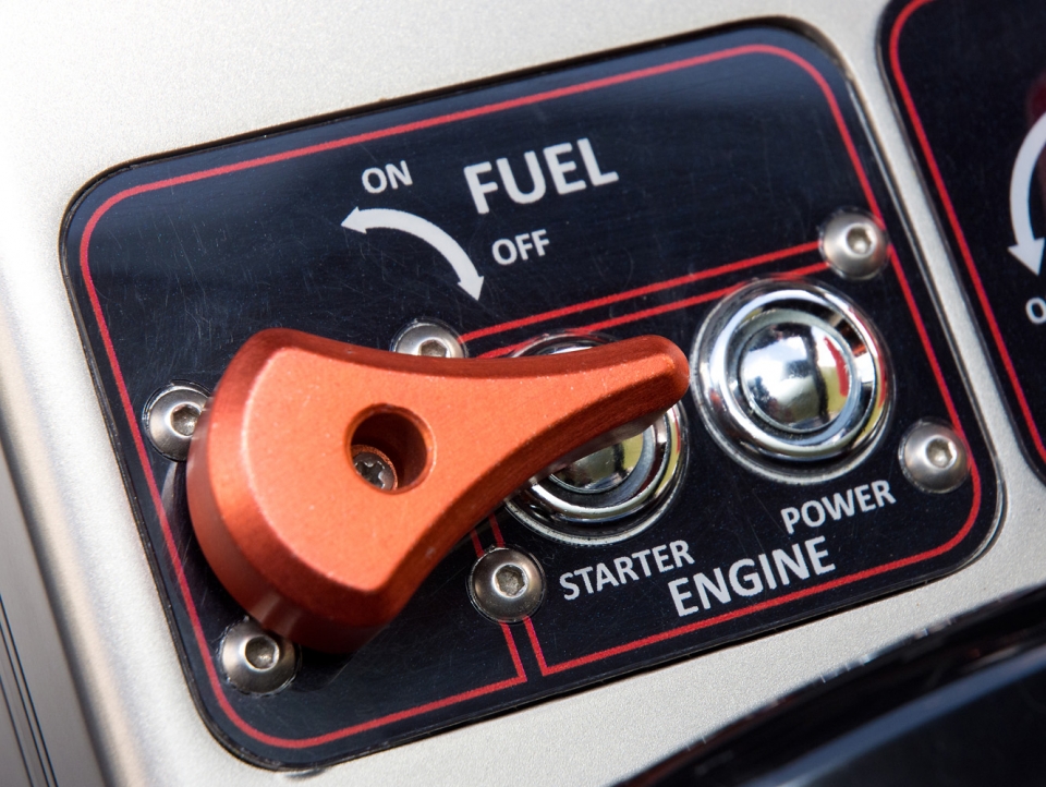 - Kraftstoffhahn auf der Mittelkonsole – mit Anlasser gekoppelt (Start nur bei Stellung „ON“ möglich)